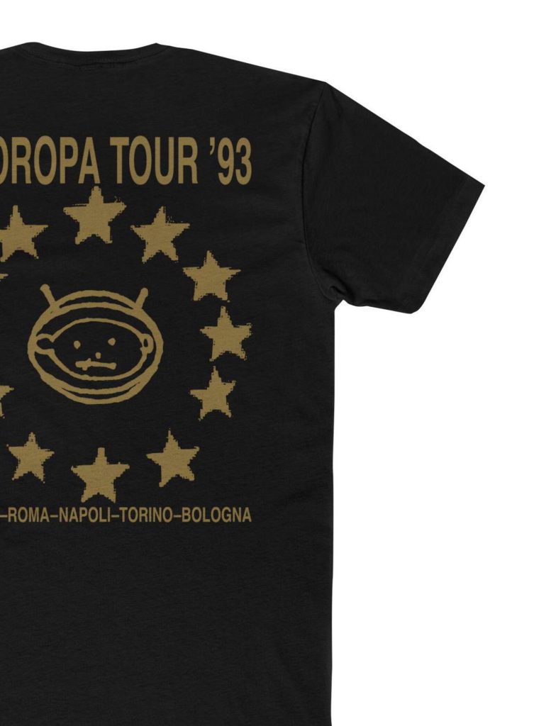 U2 Zooropa Tour T-Shirt from 1993, featuring Italian tour stops. Extra classy in the restrained black and gold color palate. Recreated from original source material and printed carefully on a Next Level 3600 t-shirt in Solid Black.