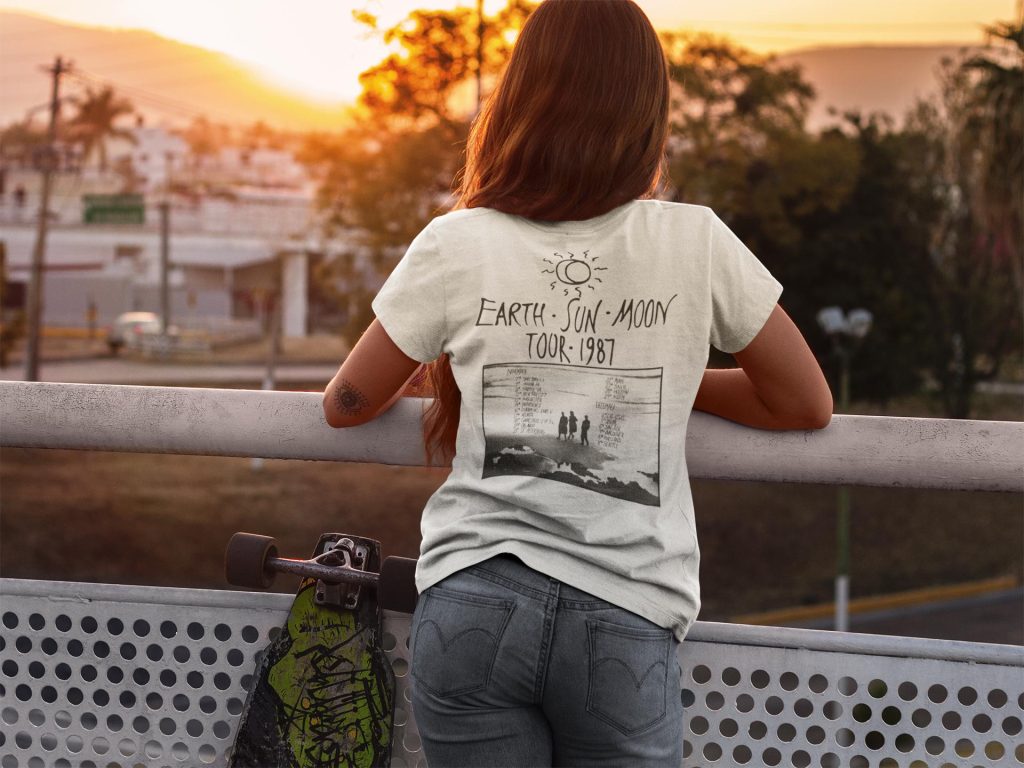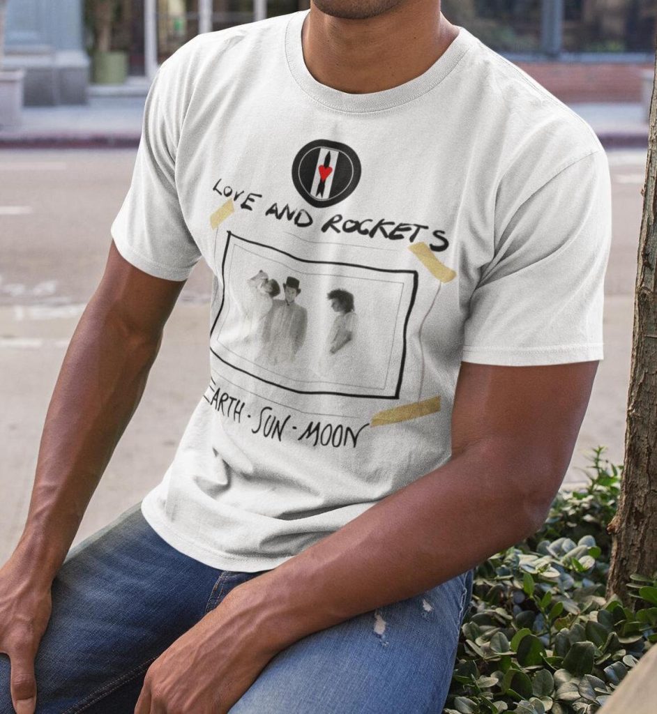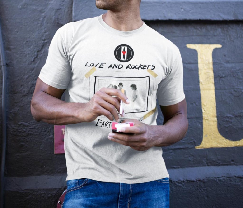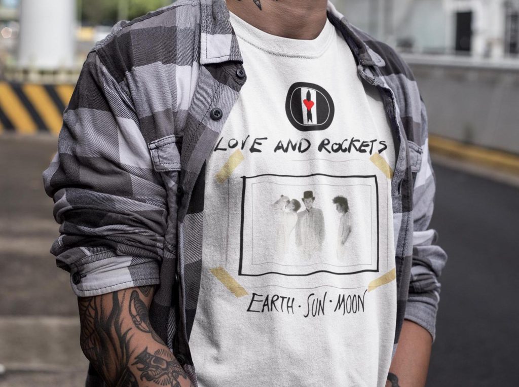 In late fall of 1987 Love and Rockets toured the U.S. with the emergent Jane’s Addiction opening the show. This is our own carefully reconstructed version of that year’s iconic t-shirt design.