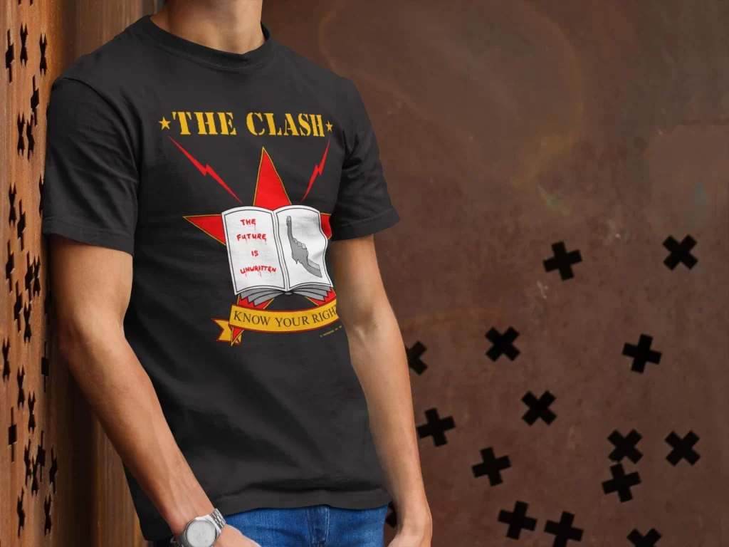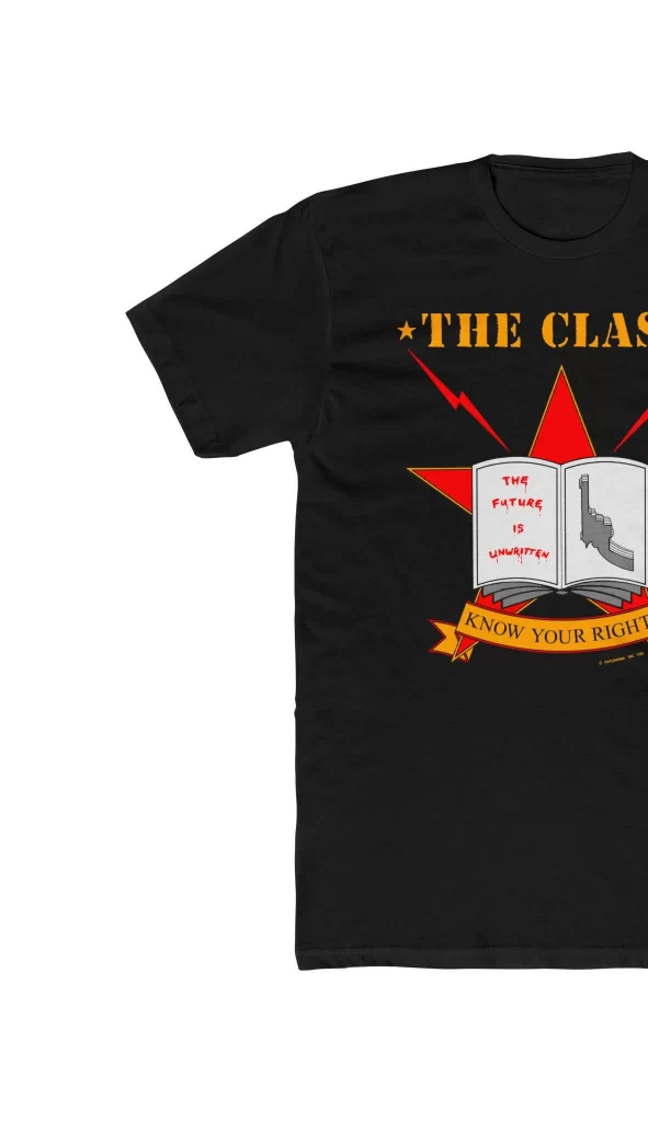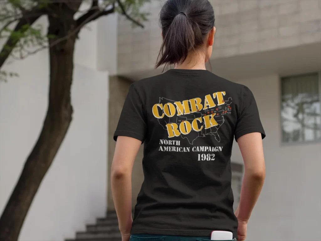 The Clash Combat Rock Tour T-Shirt, featuring the iconic “Know Your Rights” logo printed in large scale on front, plus the late Summer and Fall 1982 dates across the U.S / Canada on back.
