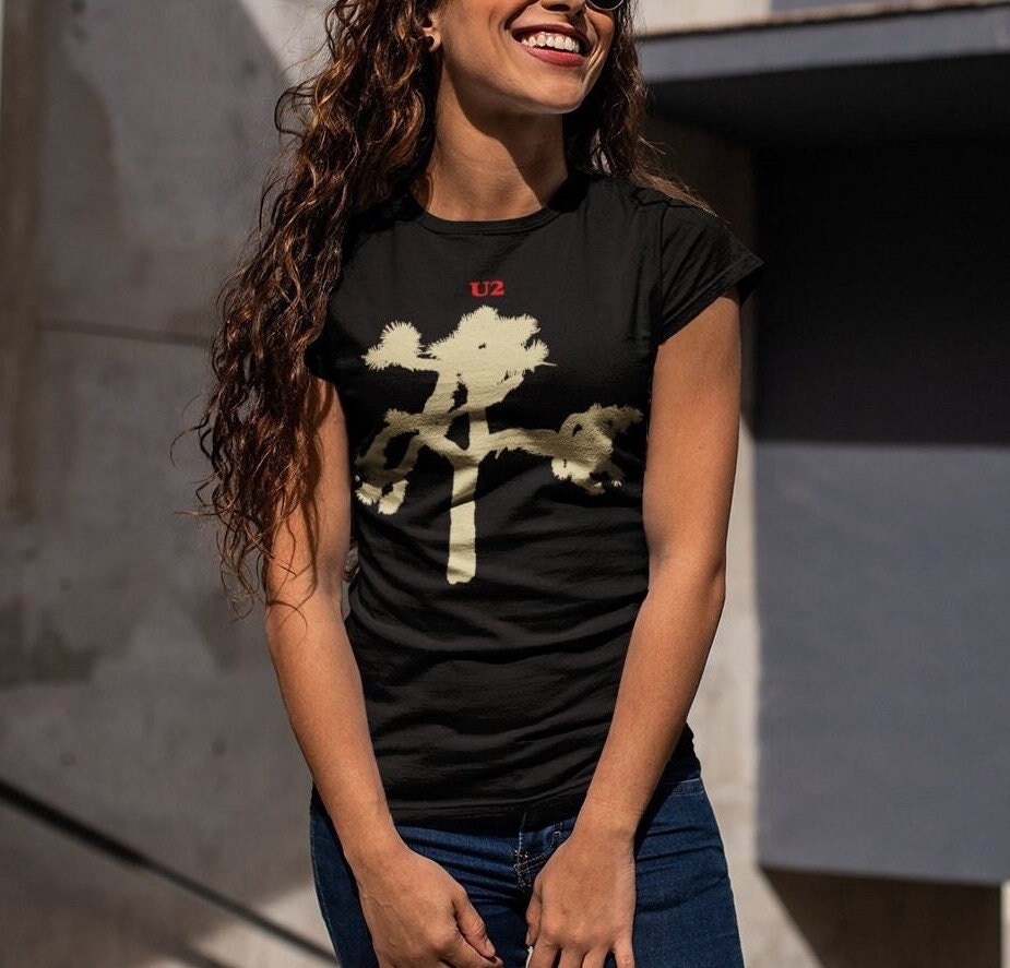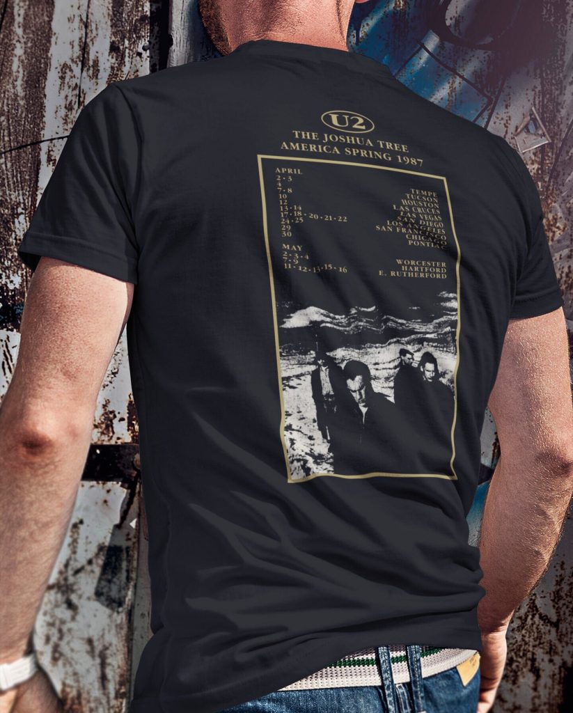 The U2 fanbase grew steadily throughout the 1980s from their debut onwards. But it was with the release of The Joshua Tree in early 1987 that the floodgates opened wide. The band toured across North America and Europe for the majority of that year, selling out each arena stop without fail. This shirt design is one of several sold on the first leg of that tour, recreated meticulously and printed with care on solid black.