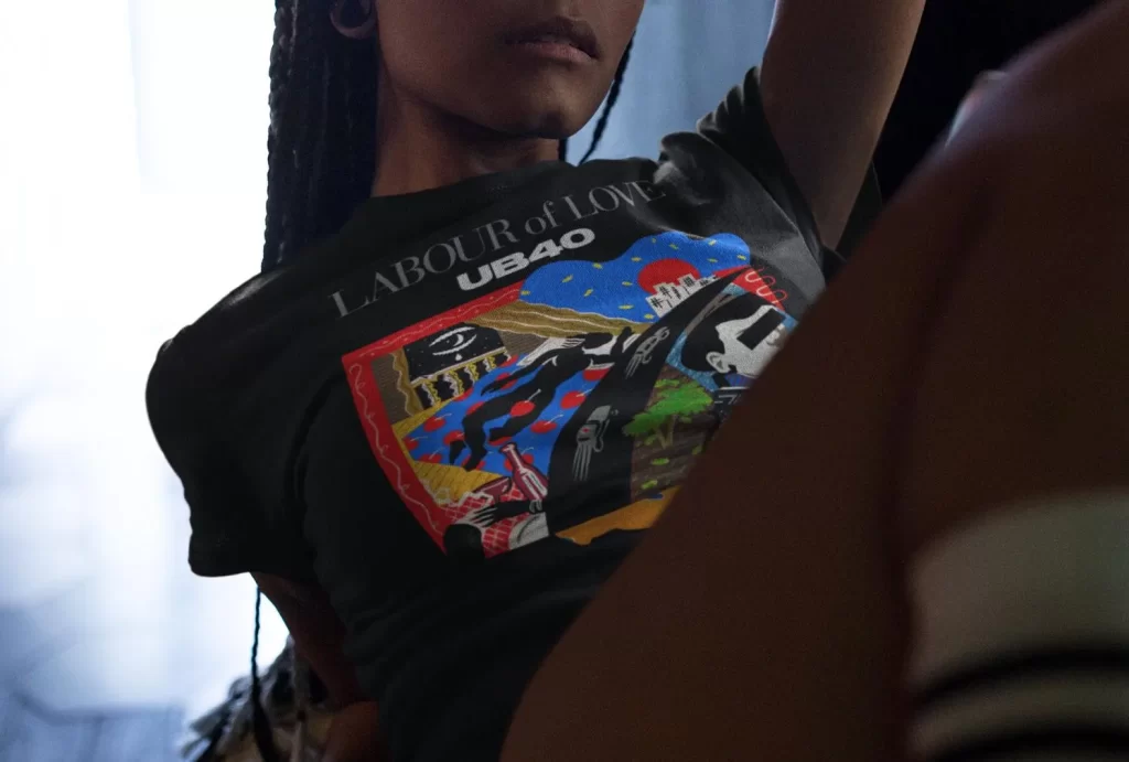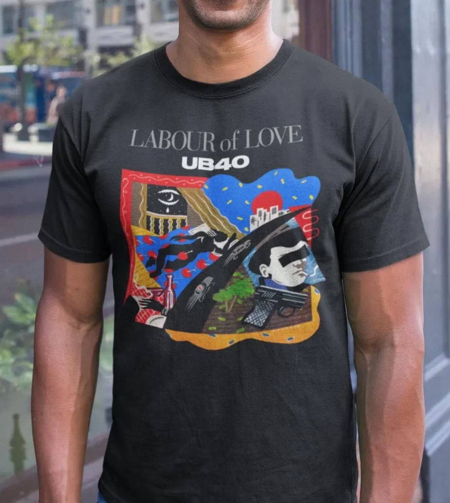 The iconic pop-art painting that graces 1983’s Labour of Love LP, carefully reproduced and lovingly printed on a premium-quality 100% cotton tee in black.
