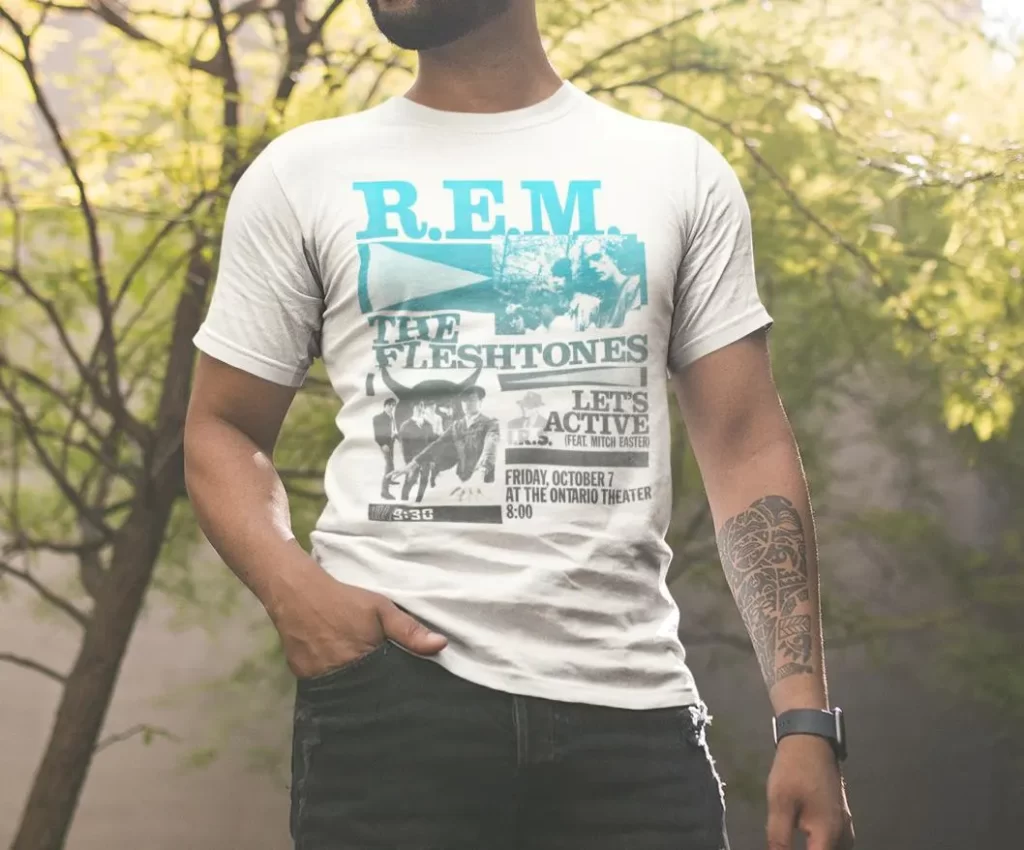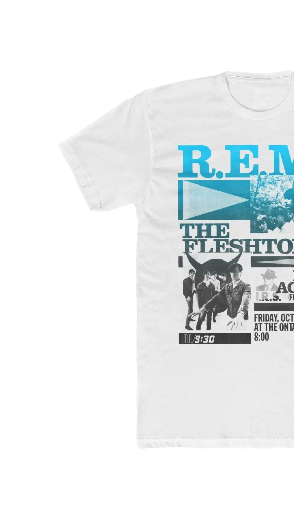 October 7 1983, R.E.M. headlined an epic IRS Records showcase including The Fleshtones and Let’s Active at the Ontario Theater in Washington D.C. We celebrate each of these band’s enduring influence with that night’s show poster carefully reproduced on a new white tee!