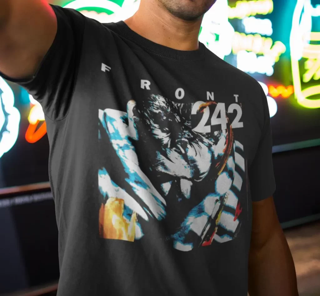 Front 242 t-shirt featuring artwork from the Interception single release, 1986. Recreated from source material and printed carefully on a premium t-shirt in solid black.