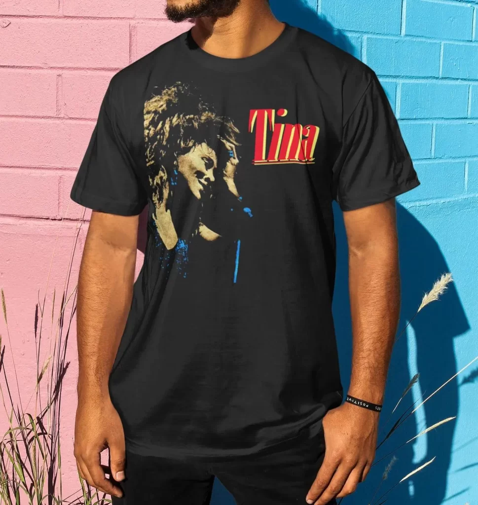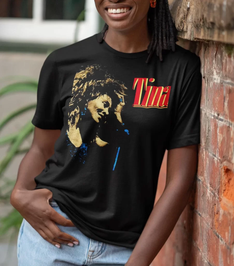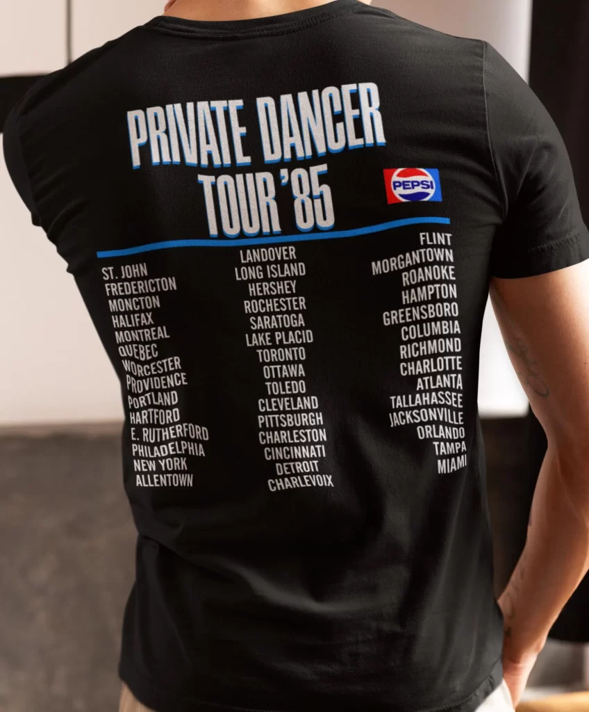 Releasing her brilliant Private Dancer LP in 1984, Tina Turner achieved a comeback that shatters the very meaning of comeback. With runaway hits in tow like “What’s Love Got to Do With It” and “Better Be Good to Me”, the Queen of Soul blew through worldwide tour dates throughout both 1984 and 1985. The back of this tee features tour stops on the 1985 North American leg. We have reproduced this item from original source material and we print it carefully on a premium t-shirt in solid black.