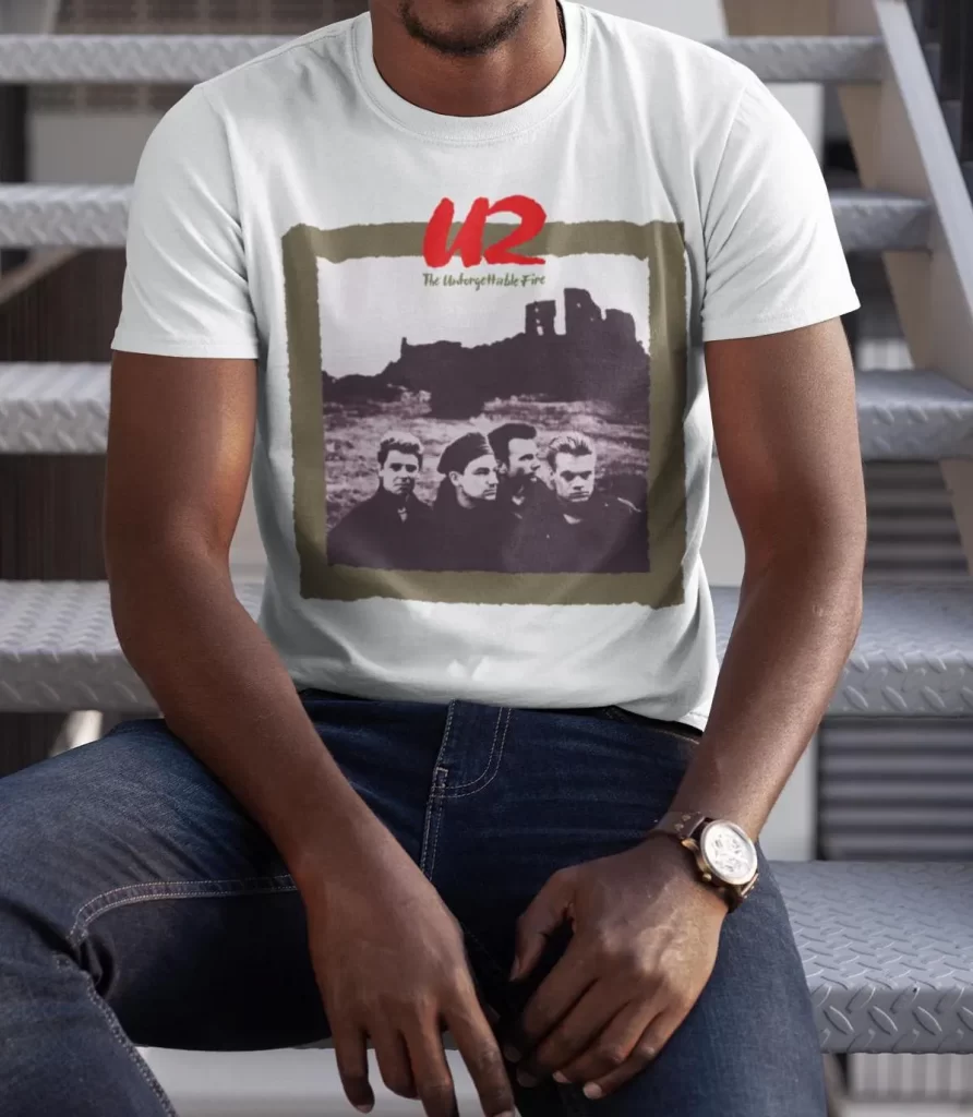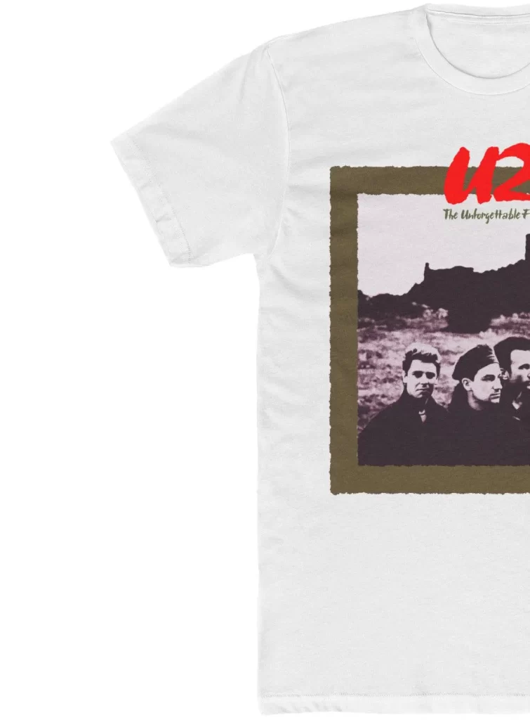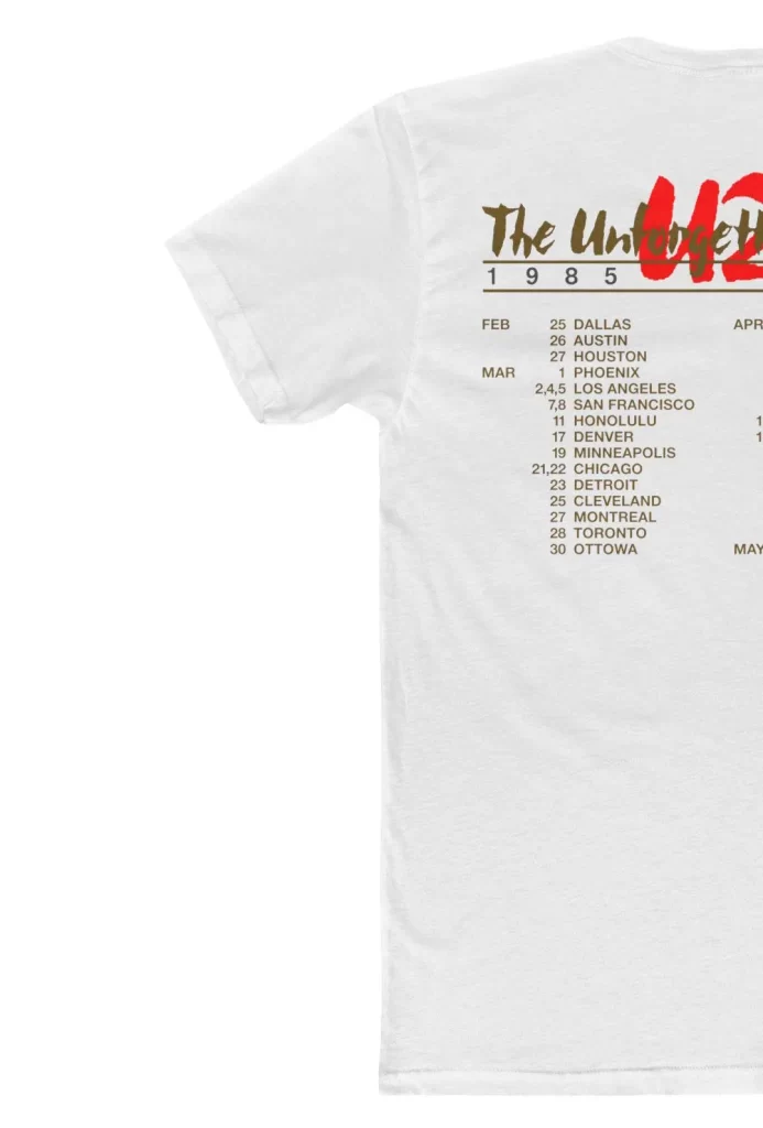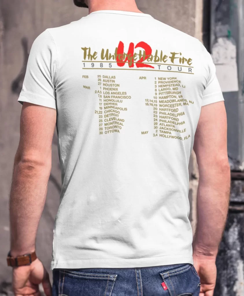With legions of new fans drawn to the groundbreaking “Pride (In The Name of Love)” hit single, U2 toured extensively on the The Unforgettable Fire LP. In this t-shirt design we have meticulously recreated one of several gorgeous shirts sold on that tour. Spring 1985 tour dates are found on the back.