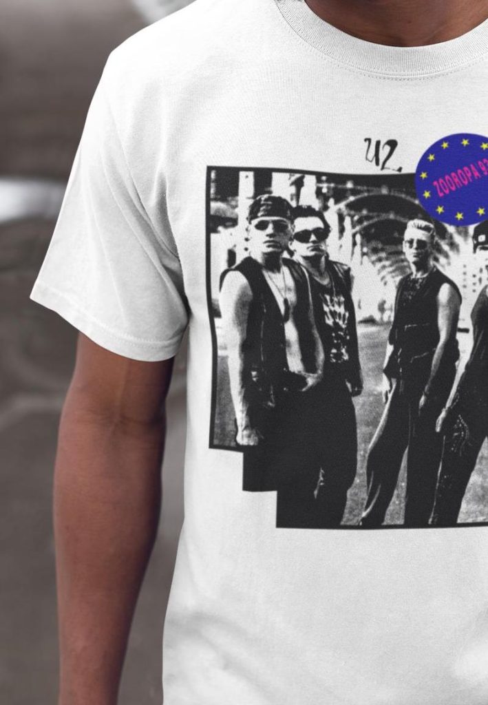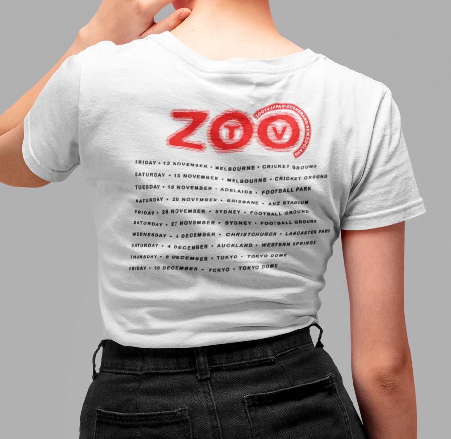 After a year on the road touring Achtung Baby, U2 transitioned their ZooTV tour into the Zooropa tour — hitting arenas across Europe as well as Australia, New Zealand and Japan. This t-shirt design features the cities and dates of the latter on the back, and a killer photo of the band in full Zoo mode on front. Remastered from original source material and printed with care on a premium t-shirt in solid white.