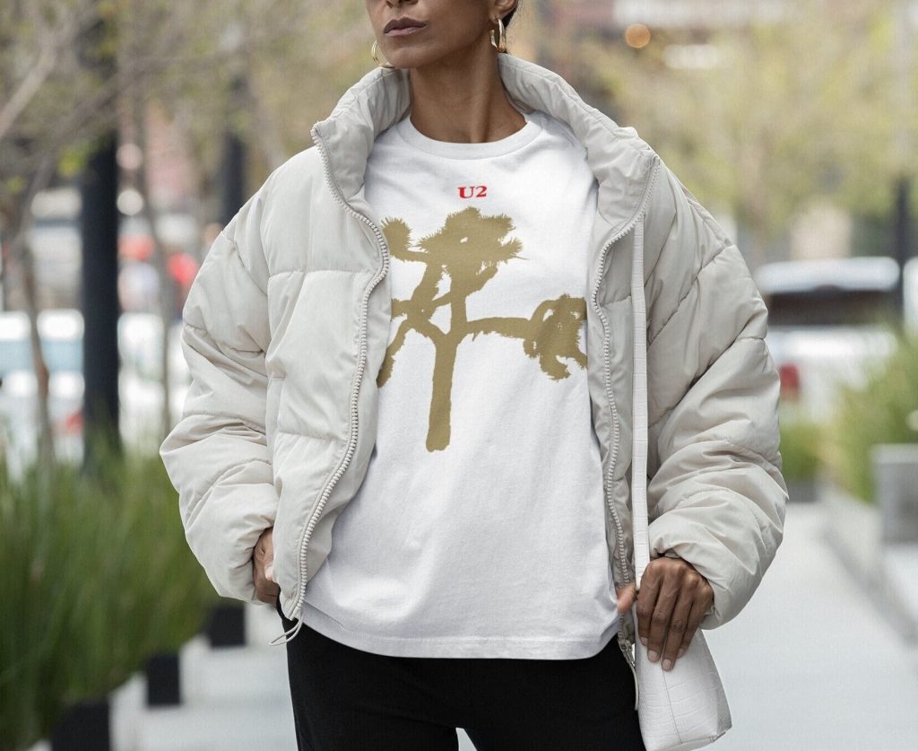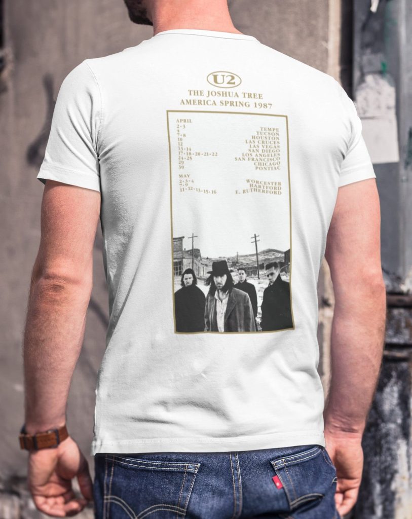 The U2 fanbase grew steadily throughout the 1980s from their debut onwards. But it was with the release of The Joshua Tree in early 1987 that the floodgates opened wide. The band toured across North America and Europe for the majority of that year, selling out each arena stop without fail. This shirt design is one of several sold on the first leg of that tour, recreated meticulously and printed with care on a premium t-shirt in white.